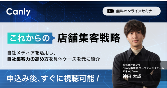 Googleビジネスプロフィール(旧・Googleマイビジネス)・HP・各SNSの一括管理サービス「Canly(カンリー)」の開発・提供を行う株式会社カンリー(所在地:東京都渋谷区、代表取締役:辰巳 衛,秋山 祐太朗)は、無料ウェビナー『これからの店舗集客戦略~自社メディアを活用し、自社集客力の高め方を具体ケースを元に紹介~』を公開いたしました。