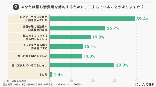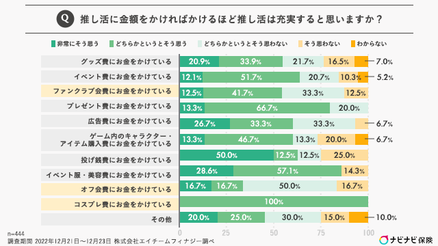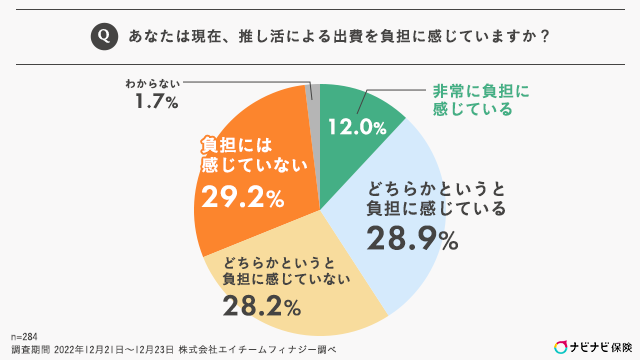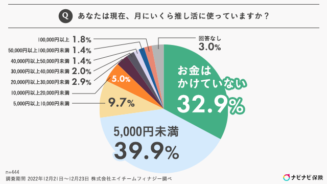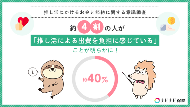 株式会社エイチームのグループ会社である株式会社エイチームフィナジー(本社:大阪府大阪市、代表取締役社長:間瀬文雄)は、「お金の不安を解消する」メディアのナビナビ保険にて、15歳以上75歳未満の男女約450名を対象に「推し活にかけるお金と節約に関する意識調査」を実施しました。