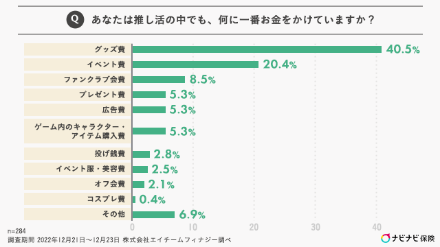 「推し活の中で何に一番お金をかけていますか?」という質問では、「グッズ費」にかけているという回答が40.5%と最も多く、続いて「イベント費」が20.4%という結果になりました。