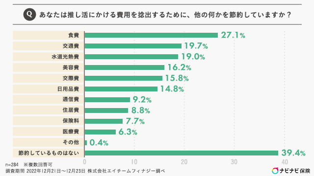 さらに、「推し活にかける費用を捻出するために他の何かを節約していますか?」という質問では、約4割の人が「節約しているものはない」と回答した一方で(39.4%)、食費(27.1%)や交通費・水道光熱費などの生活費を節約していることがわかりました。