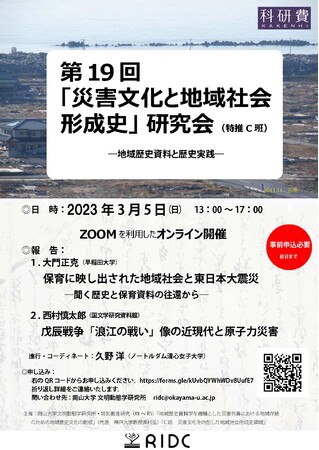 国立大学法人岡山大学(本部:岡山市北区、学長:槇野博史)文明動態学研究所(RIDC)では、第19回「災害文化と地域社会形成史」研究会-地域歴史資料と歴史実践-を、2023年3月5日(日)13:00~17:00にオンラインで開催します。