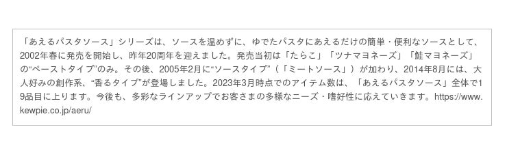 キユーピー株式会社(本社:東京都渋谷区、代表取締役 社長執行役員:高宮 満、以下キユーピー)は、「あえるパスタソース」シリーズのうち、ソースタイプの主力フレーバーである「ミートソース フォン・ド・ヴォー仕立て」をリニューアルします。自家製ドミグラスソースの配合量を増やして煮込み感を向上させ、よりコク深い味わいにしました。お客さまからの支持の高い、“ソースタイプ”のさらなる満足度向上を図ります。