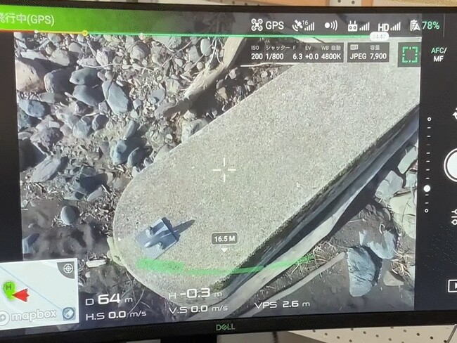 FOF本社から河川敷にある構造物へ近づくようにマイクで指示し、構造物の位置や形状をリアルタイムで確認することができました。