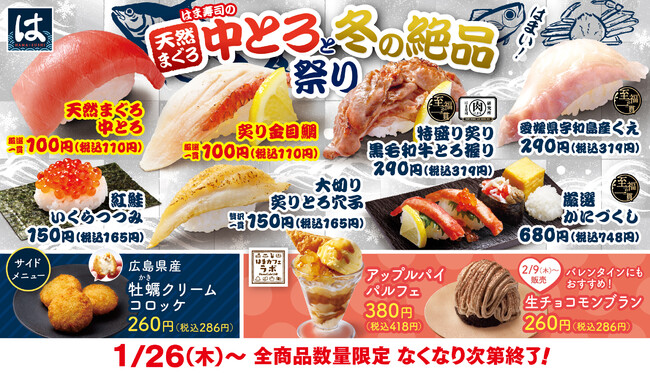 株式会社はま寿司(代表取締役社長:遠藤 哲郎 本社:東京都港区)が展開する100円寿司チェーン「はま寿司」は、1月26日(木)から「天然まぐろ中とろと冬の絶品祭り」を全国の店舗で開催します。