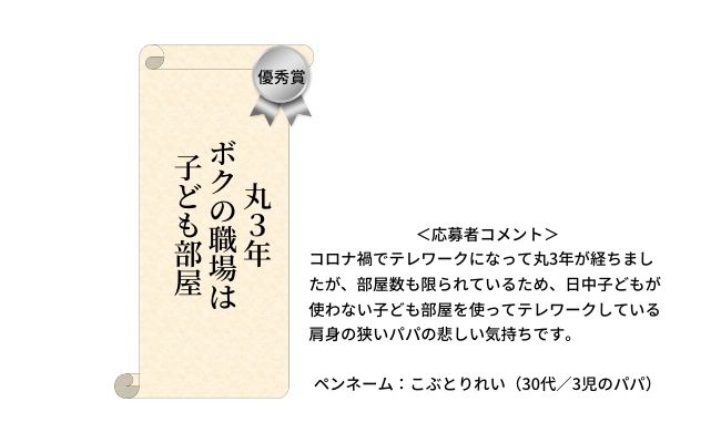 「パパ部門」からは、「優秀賞」1作品、「特別賞」4作品が選ばれました。子ども部屋でリモートワークを続けている心境、ママをやさしい目で見つめる姿、ママの偉大さなど、パパならではの目線で表現した作品が目立ちました。どの作品にも大切な家族への想いが詰まっていて、育児に奮闘するパパの姿も想像できます。