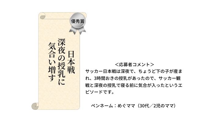 もっとも多くの応募が集まった「ママ部門」からは、「優秀賞」2作品、「特別賞」4作品を選考。コロナ禍での出産シーンを彷彿とさせる作品や、2022年冬に世界中で開催されたサッカー大会と子育ての日常をリンクさせた作品、加工アプリの話など、このご時世ならではのエピソードが光る作品が選ばれました。