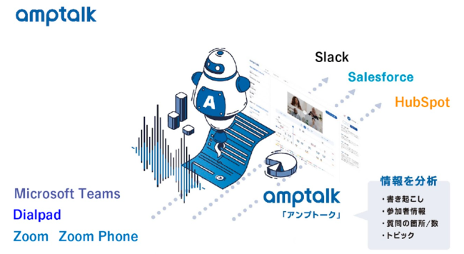 そのセールスイネーブルメントを実現するために『アンプトーク』は、Web会議システムやIP電話の自動書き起こし・分析・解析を可能とするだけでなく、自動でSalesforceやSlack、HubSpotに共有されることで、時間や労力を削減しながら商談の共有・振り返りが可能となります。これらを通して『アンプトーク』はセールスイネーブルメントの実現します。
