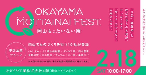 「岡山もったいない祭り(主催:岡山もったいない祭り 実行委員会)」を2023年2月18日(土)、ダイヤ工業株式会社(岡山県岡山市)で開催いたします。当日は岡山県内の企業約10社が集まり、ものづくりの過程で生じるB品や廃盤品を割引価格で販売。売上の20%を子ども食堂の運営団体に寄付します。