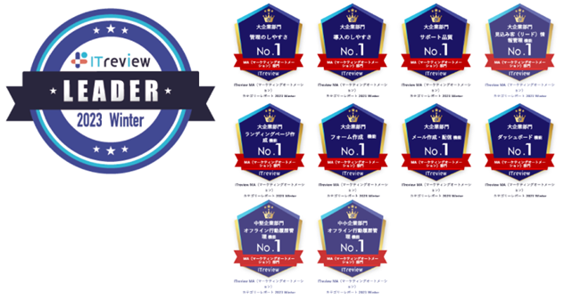 また、MA部門においては管理のしやすさ、導入のしやすさ、サポート品質、見込み客(リード)情報管理機能、ランディングページ作成機能、フォーム作成、メール作成・配信機能、ダッシュボード機能(大企業部門)、オフライン行動履歴管理機能(中堅企業、中小企業部門)でもNo.1を獲得しています。