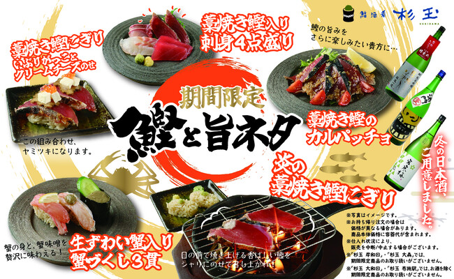株式会社FOOD & LIFE INNOVATIONS(本社:東京都千代田区、代表取締役社長:山邉 圭介)は「鮨 酒 肴 杉玉」にて、1月27日(金)より、最後の仕上げとして、お客さまの目の前で藁に火をつけて焼き上げる「炎の藁焼き鰹にぎり」や、生ずわい蟹が登場する『鰹と旨ネタ』フェアを期間限定で販売いたします。