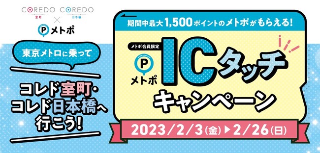 東京地下鉄株式会社(本社:東京都台東区、代表取締役社長:山村 明義、以下「東京メトロ」)では、メトロポイントクラブ(以下、「メトポ」)会員のお客様を対象に、東京メトロ銀座線・半蔵門線三越前駅または銀座線・東西線日本橋駅(以下、「キャンペーン対象駅」)までご乗車いただき、コレド室町・コレド日本橋へお出かけされたお客様に対して、1日最大250ポイントのメトポを進呈するキャンペーンを、2023年2月3日(金)から2月26日(日)まで実施します。