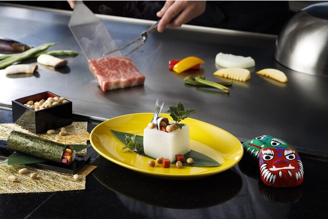 季節の節目の行事でもある「節分」を料理を通じて楽しんでいただき、ホテルに訪れるゲストに日本の伝統文化を鉄板焼きでも感じてもらえるように趣向を凝らした内容でお届けいたします。関西では丸かぶりをする「恵方巻」をイメージした一品や、豆まきを連想させる料理等を心ゆくまでご堪能ください。