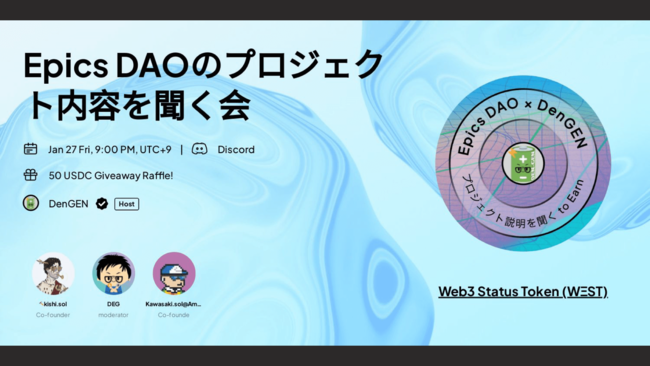 2023 年 1 月 27 日(金) 21:00 より DenGEN コミュニティにて「Epics DAO のプロジェクト内容を聞く会」が開催されます。