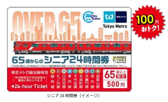 シニア24時間券は通常600円の東京メトロ24時間券よりも100円お得な500円で、使用開始から24時間東京メトロ全線が乗り放題となる大変便利な乗車券です。定期券うりば(中野駅、西船橋駅及び渋谷駅を除く)及び一部の駅事務室で、30,000枚限定で発売します。(前売り券のみ)