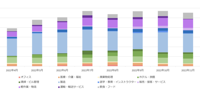 一方、物流・軽作業においては、1-4月期の応募数が低調で5月以降に高い数値、伸び率を示しています。これは、大手ECサイトが新規倉庫の立ち上げによる人員確保を目的として募集を強化したことや、夏場に大型セールを実施していることに合わせて人員を増強していることが挙げられます。セールは年末年始と夏場に二極化していることから、2023年も同様の傾向になるものとGuidableは予測しています。