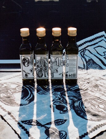 A.P.C.オリーブオイルは、グラフィックデザインスタジオM/M (Paris)のマティアス・オグスティニアックがデザインしたオリジナルラベルを冠しています。マティアスは、ジャン・トゥイトゥが撮影したモンフラン城の公園にあった銅像から着想を得て、リネンのティータオルもデザインしました。