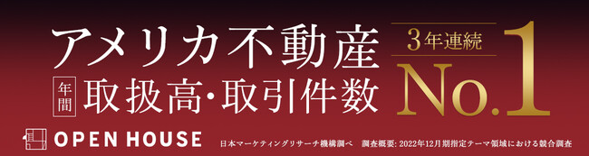 株式会社オープンハウスグループ(本社 東京都千代田区、代表取締役社長 荒井正昭、以下「当社」)のグループ子会社である株式会社オープンハウスのアメリカ不動産事業が、「アメリカ不動産年間取引数・取扱高No.1」「安心と信頼のアメリカ不動産投資サポートNo.1」を獲得いたしました。集計期間(2021年10月~2022年9月)の取引数は1,071件、取扱高は610.6億円($1=124.55円)でした。