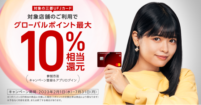 三菱UFJニコスは2月1日から7月31日まで、「三菱UFJカード」個人会員向けに、ポイント優遇サービス加盟店での利用額(上限10万円)の最大10%相当(※)のポイントをもれなく進呈するキャンペーンを開催します。 (※)1ポイント=5円換算の商品と交換した場合