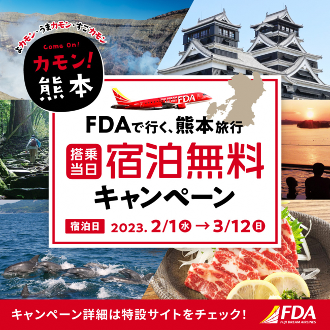 富士山静岡空港利用促進協議会は、富士山静岡空港からFDA静岡-熊本線を利用して熊本方面へお出掛けになる方を対象に、搭乗当日の対象宿泊施設宿泊費を無料とするキャンペーンを実施します。