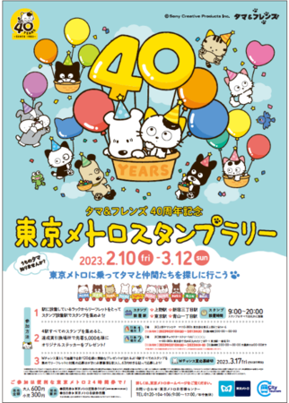 東京地下鉄株式会社(本社:東京都台東区、代表取締役社長:山村 明義、以下「東京メトロ」)では、「タマ&フレンズ40周年記念 東京メトロスタンプラリー」を2023年2月10日(金)から3月12日(日)まで開催します。