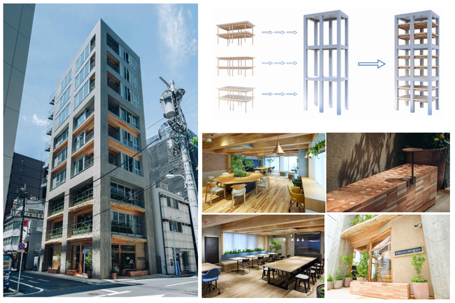 「KITOKI」はSRC造による3層飛ばしのメガストラクチャーの内側に木造建築を組み合わせた10階建ての店舗兼オフィス。コンクリートの持つ100年もの耐久性と、木造建築の軽やかさのコンビネーションにより、都市の木質化に新しい可能性を拓きます。