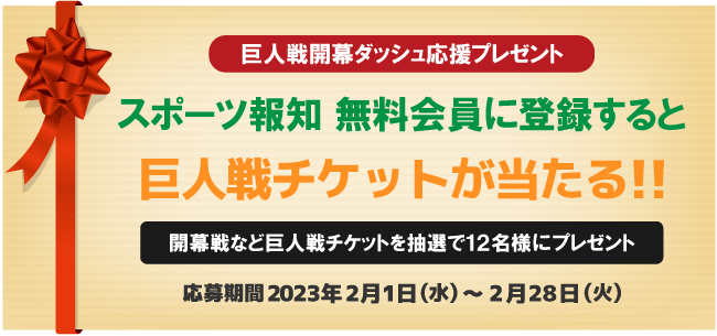 スポーツ報知では3月31日、中日との開幕戦(東京ドーム)をはじめ、3、4月のジャイアンツ戦計6試合のチケットをスポーツ報知無料会員限定でプレゼントします。開幕ダッシュに挑む原巨人の熱い戦いをぜひ、球場で味わってください。応募締め切りは2月28日。当選は発送をもって代えますが、当選した方には事前にメールで連絡いたします。