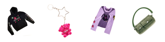 左から、 SHRUNKEN META HOODIE ¥39,600/ SUPERSIZED CHARM KEY CHAIN ¥19,800/ CB LONGSLEEVE TEE ¥36,300/ TWO POCKET SHOULDER BAG ¥47,300