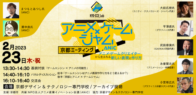 株式会社ツクリエ(本社:東京都千代田区 代表取締役:鈴木英樹 以下ツクリエ)が、京都市より運営受託するKYO-CCE Lab(京シーシーイーラボ)は、「NPO法人アニメ産業イノベーション会議(ANiC・アニック)」(以下、ANiC)との連携にて、ゲームエンジンを活用したアニメの新しい表現と、その作り方について語る「アニメ×ゲームジャム 京都ミーティング」を、2月23日(木・祝)に開催します。
