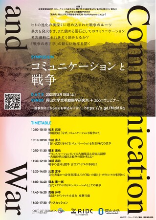 国立大学法人岡山大学(本部:岡山市北区、学長:槇野博史)の岡山大学文明動態学研究所は、2023年2月18日(土)にオンラインで開催される新学術領域研究「出ユーラシアの統合的人類史学」(計画研究A03「集団の複合化と戦争)主催の公開シンポジウム「コミュニケーションと戦争」に共催しています。