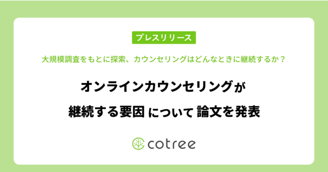 オンラインカウンセリング・コーチングの「cotree」を展開する株式会社cotree(本社:東京都港区、代表取締役:西岡恵子、以下cotree)は、早稲田大学人間科学学術院の桂川泰典准教授を中心とした研究グループと「オンラインカウンセリングにおける初期ドロップアウト要因」に関する共同研究を行い、論文を発表しました。
