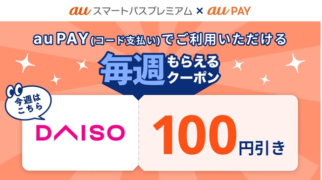 「auスマートパスプレミアム」は、日常生活でのお買い物や、映画などのエンタメにお使いいただけるおトクなクーポンをはじめ、スマートフォンをもっと快適かつ楽しくお使いいただくためのデジタルコンテンツや安心をお客さまに提供するサービスです。この度、「auスマートパスプレミアム」では、au PAY(コード支払い)でご利用いただける「毎週もらえるクーポン」として、DAISO(ダイソー)で101円以上のお買い物に使える100円割引クーポンの提供を2023年2月6日からスタートします。