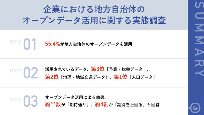 調査から、半数以上の企業が、人口や地理、予算・税金などの地方自治体のオープンデータを活用しており、オープンデータ活用による効果として、約半数が「期待通り」、約4割が「期待を上回る」と回答し、地方自治体のオープンデータを活用することの有効性が明らかとなりました。