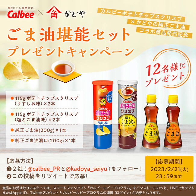 応募方法:カルビーPR部公式Twitterアカウント(@calbee_PR)及び、かどや製油公式Twitterアカウント(@kadoya_seiyu)をフォロー&キャンペーン投稿をリツイート