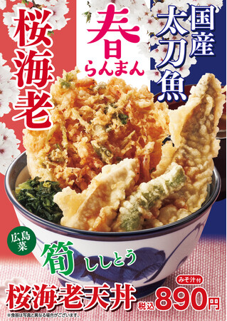 香ばしくサクサクと軽い仕上がりの「桜海老のかき揚げ(三つ葉入り)」、ほどよい歯ごたえで天ぷらによく合う春野菜の「たけのこ」、鮮やかな緑色の「ししとう」、ふんわりした「国産太刀魚」の天ぷらをのせ、さっぱりとした「広島菜(青じそ風味)」を添えました。春の訪れを存分に感じられる天丼です。