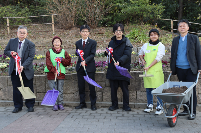 ・完熟たい肥お引渡し会要領:公園内の花壇に移動し、以下参列者で肥料を施肥しました