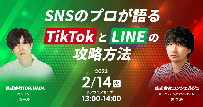 株式会社TORIHADA(本社:東京都渋谷区、代表取締役社長:若井映亮)は、株式会社コンシェルジュとともに「SNSのプロが語るTikTokとLINEの攻略方法」と題したウェビナーを2023年2月14日(火)13時に開催いたします。