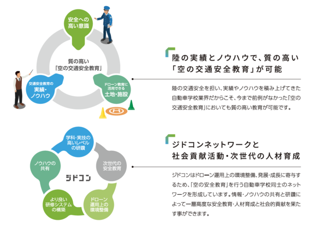 目前に迫る、空と陸の交通モビリティが行き交う未来。自動車学校はその交差点で「交通教育」を担いたい。私たちジドコン(一般社団法人全国自動車学校ドローンコンソーシアム)は、『自動運転×ドローン×空飛ぶクルマ=自動車教習所』という時代を見越して、全国ネットワークを駆使しながら、これからの新しい使命、社会貢献を積極的に果たしていく所存です。