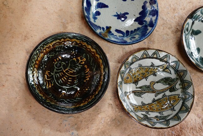 13連という最大級の登窯を有する、読谷山焼北窯。1992年に各地で修行していた松田米司、松田共司、宮城正亨、與那原正守の4氏が共同で窯を築き、沖縄伝統の手法を受け継ぎながら、現在に合った様々な器を作り続けている。伝統的な色、模様、はっきりとした色合いや力強さが特徴。