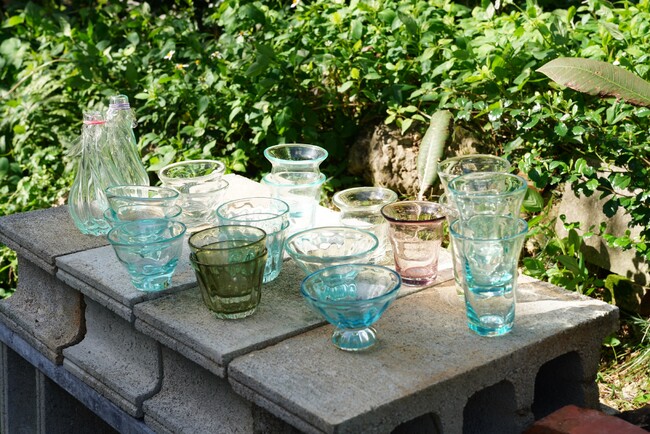 うるま市に工房を構える再生硝子製作所。『ガラス工房清天』での修行を経て、ガラス職人・鈴木伸司が、2018年に設立したガラス工房。屋号にも記されているようにすべて再生ガラスからできている。原料となる廃瓶や窓ガラスを収集するところから始まり、一つ一つ手作業でつくられているため、できあがる作品も一つ一つ違った顔を持ち、主張しすぎない“色合い”と“カタチ”が特徴。