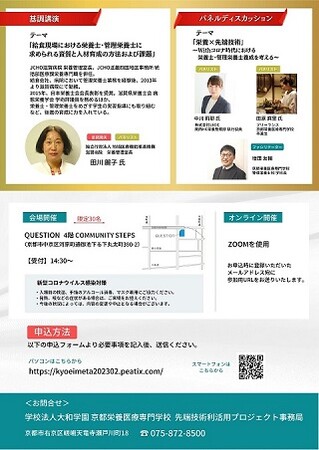 京都栄養医療専門学校では文部科学省より「専修学校における先端技術利活用実証研究」の委託を受け、「栄養士・管理栄養士分野におけるメタバースを活用した遠隔教育モデル構築プロジェクト」を発足しました。シンポジウムでは3名のスペシャリストをお招きし、今後の栄養士・管理栄養士の人材育成についての基調講演をはじめ、先端技術が業界にもたらす変革や最新の取組みについてパネルディスカッション形式で忌憚のないお話を伺います。