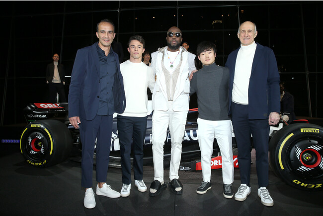 左より アルファタウリCEO アーメット・メルカン、F1ドライバー ニック・デ・フリース、ミュージシャン ワイクリフ・ジョン、F1ドライバー 角田裕毅、スクーデリア・アルファタウリ代表 フランツ・トスト