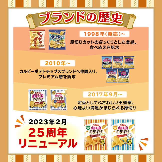 「ポテトチップスギザギザ(R)」シリーズは、「心地よい満足感と気分転換」をコンセプトにした厚切りギザカットのポテトチップスです。1998年に「ギザギザポテト」として期間限定で登場し、2010年からは現在の「ポテトチップスギザギザ(R)」に名前を変え、通年販売しています。2017年からは現在のストライプ柄のパッケージを採用。2020年10月には地球にもやさしいブランドを目指して、パッケージサイズを変更(横幅を短くすることで、商品配送時の二酸化炭素の排出量削減につなげる)しました。