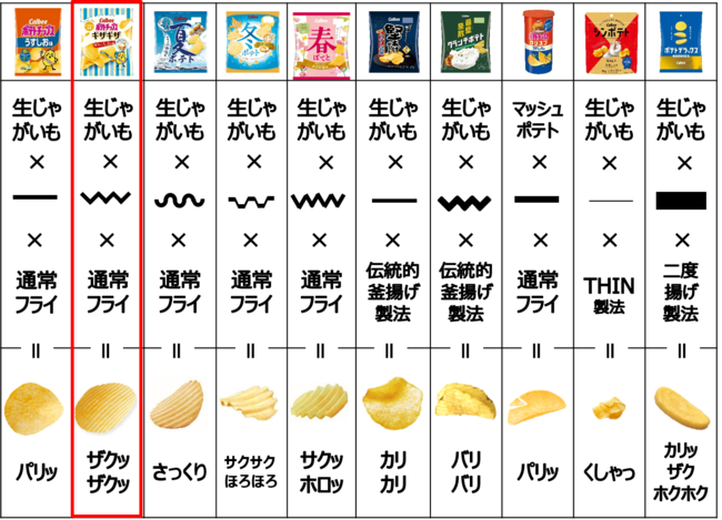 「ポテトチップスギザギザ(R)」は、ザクッとした食感にこだわった商品です。カルビーは、中期経営計画(2020年3月期~2024年3月期)の重点課題のひとつとして「スナック事業の革新」を掲げており、食感にこだわった商品開発や、“食感バリエーション”を増やすなど、お客様のさまざまなご期待に応えるべく、新しい挑戦を続けております。