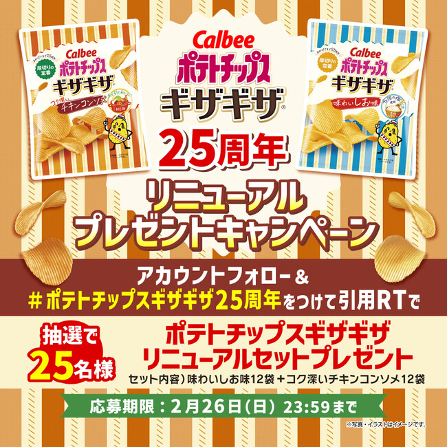 「ポテトチップスギザギザ(R)」のリニューアルに合わせてカルビーPR部公式Twitterアカウント(@calbee_PR)上で、プレゼントキャンペーンを実施します。アカウントをフォロー&キャンペーンツイートをリツイートすることでリニューアルセット(「味わいしお味」、「チキンコンソメ」)が、25名(周年にちなんで)に当たります。