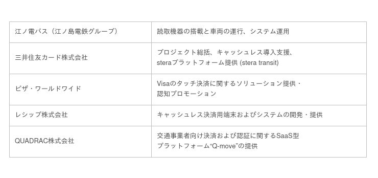 株式会社江ノ電バス(本社:神奈川県藤沢市、代表取締役社長 飯塚 周次)、三井住友カード株式会社(本社:東京都江東区、代表取締役社長:大西 幸彦)、ビザ・ワールドワイド・ジャパン株式会社(本社:東京都千代田区、代表取締役社長:スティーブン・カーピン)、レシップ株式会社(本社:岐阜県本巣市、代表取締役社長:杉本 眞)、QUADRAC株式会社(本社:東京都港区、代表取締役社長:高田 昌幸)は、江ノ電バスが運行する羽田空港リムジンバスで、Visaのタッチ決済を導入することを発表いたします。