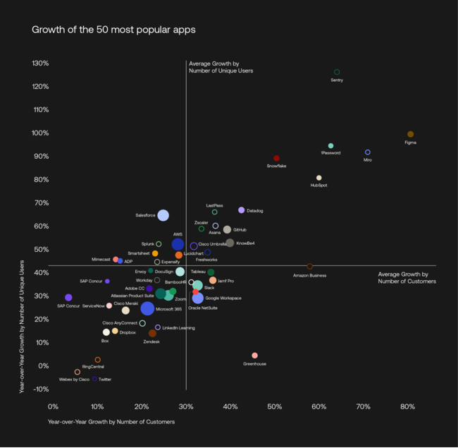 最も急成長したアプリとなったのは、Kandjiで、顧客数の成長率が前年比172%増となりました。KanjiはAppleのモバイルデバイス管理アプリで、IT管理者が繰り返し行う作業を自動化します。Kandjiの急成長は、ITチームがより少ない労力でより多くのことを行おうとする中で、自動化が強く求められていることを示唆しています。