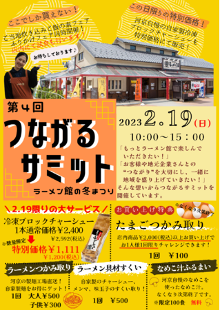 株式会社河京 会津喜多方ラーメン館本館(本社:福島県喜多方市、代表取締役:佐藤富次郎)は、スタッフ厳選の「ご当地炊き込みご飯の素&ふりかけフェア」、河京自慢の自家製チャーシューを特別価格での販売、前回のつながるサミットで大好評だった卵のつかみどり、河京工場直送のラーメンつかみどり、地元のお店の人気フード販売なども行う「第4回つながるサミット」を2023年2月19日(日)に開催致します。