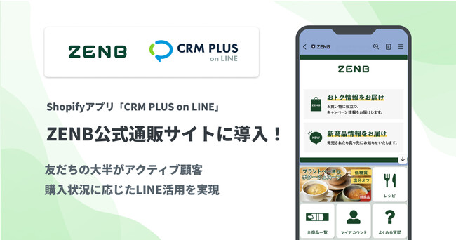 株式会社ソーシャルPLUS(所在地:東京都文京区、代表取締役:岡田 風早)が提供するShopify(ショッピファイ)アプリ「CRM PLUS on LINE」は、株式会社ZENB JAPAN(ゼンブ ジャパン)が運営するシリーズ累計1,000万食を突破した「ZENB公式通販サイト」に採用いただきました。