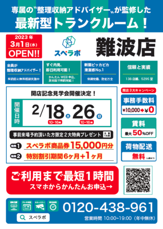 【難波店/3月1日(水)オープン】見学から契約、解約まで完全非接触・非対面、お申し込みからご利用まで最短1時間!都内、大阪などにて絶賛運営中のトランクルーム【スペラボ】が桜川駅近くに出店!