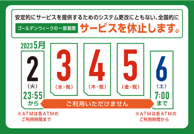 ゴールデンウィークにおけるゆうちょ銀行の各種サービスの取り扱い休止について